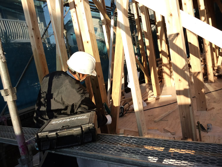 上棟工事が順調に進んだので防腐防蟻材エコボロンを塗りました。